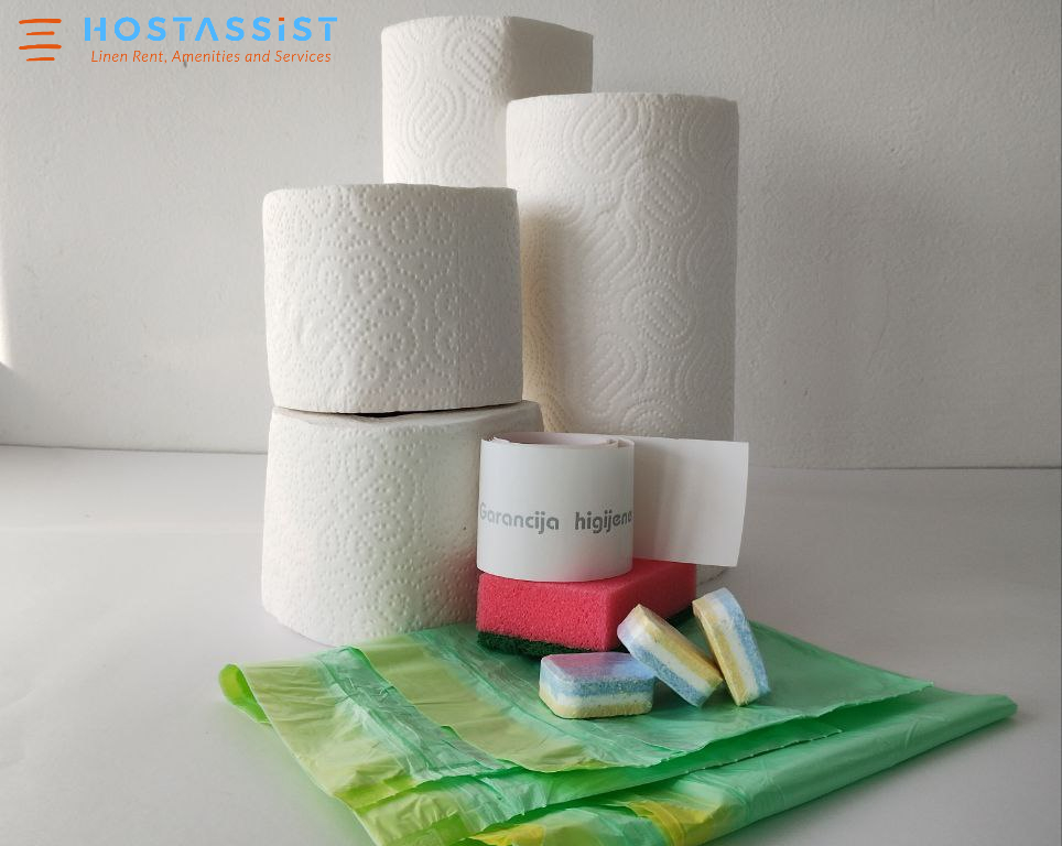 Standardni set (toaletne i kuhinjske potrepštine i pribor) za apartman. Sve sto je potrebno kod svake smjene gostiju.